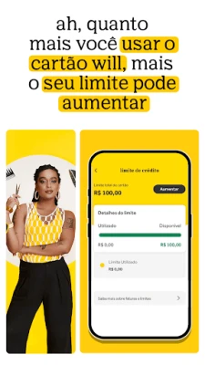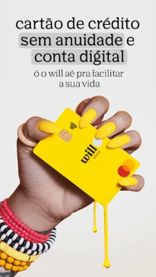 Explore um universo de facilidades projetadas para simplificar suas finanças. Abra sua Conta Digital Totalmente Grátis, equipada com ferramentas inteligentes para você planejar, investir e economizar sem complicações, tudo na palma da sua mão. Adicione ao seu arsenal financeiro o Cartão de Crédito Internacional Mastercard® sem Anuidade, que desbloqueia vantagens a cada uso, e utilize até cinco Cartões Virtuais seguros para suas compras online, diretamente conectados à sua conta will. E para turbinar seu poder de compra, conheça o plim!, o programa de limite do will, que torna o aumento do seu crédito uma experiência divertida e transparente, revelando desde o início o potencial de crescimento.
