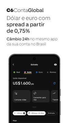 Abra as portas para o mundo com a C6 Conta Global, a ferramenta perfeita para quem busca eficiência e economia em transações internacionais. Desfrute de cotação comercial e spread reduzido, com economia média de 50% comparado a cartões de crédito internacionais. Sem custos mensais para compras, saques e transferências globais, e um cartão de débito aceito em mais de 190 países, com câmbio 24h. Amplie seus horizontes de riqueza com os investimentos diversificados do C6 Bank, que vão desde ações e títulos de renda fixa no mercado nacional até opções globais como Time Deposit, ADRs, ETFs e Reits, tudo gerenciado diretamente pelo aplicativo da sua conta corrente.