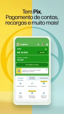 Desperte o potencial financeiro com o PagBank, seu universo completo para gerenciar dinheiro e alcançar objetivos. Simplifique o cotidiano com pagamentos de contas e boletos, transferências Pix e TED ilimitadas, e recargas de celular com bônus direto no seu saldo. Até mesmo a antecipação do seu FGTS se torna mais acessível, tudo em um só lugar, desenhado para sua conveniência e controle total.