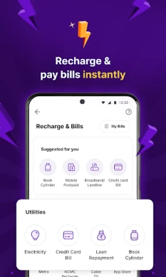 PhonePe simplifica cada transação diária. Efetue pagamentos online em e-commerces como Flipkart, Amazon e Myntra, ou peça refeições e faça compras de supermercado com Zomato, Swiggy e Bigbasket. Planeje viagens com Makemytrip e Goibibo, e pague em lojas físicas usando códigos QR. Além disso, recarregue celulares (Jio, Vodafone, Airtel) e DTH (Tata Sky, Airtel Direct), e quite contas de cartão de crédito, fixo, eletricidade, água, gás e banda larga, tudo convenientemente em um só local.